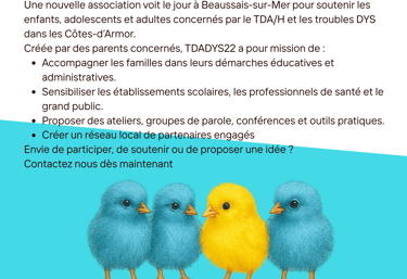 TDADYS22 accueille, soutient et rassemble. Que vous soyez concerné par le Tda(H), les troubles dys, la neurodiversité, parent, pro ou juste en quête de repères, vous avez votre place.